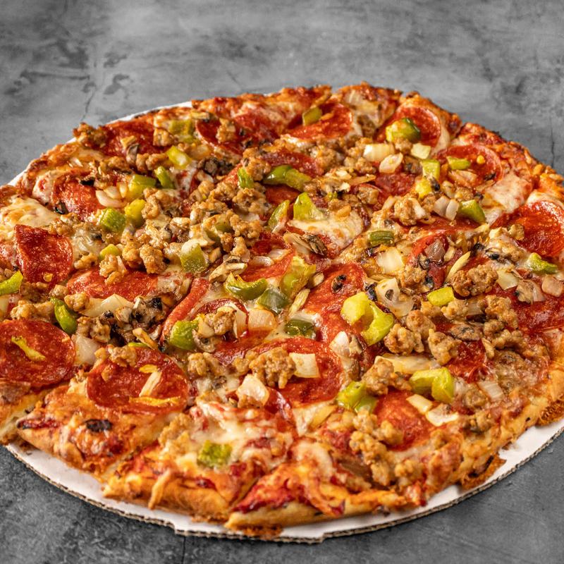 Pepperoni, sausage, mushrooms, onions, bell peppers.
